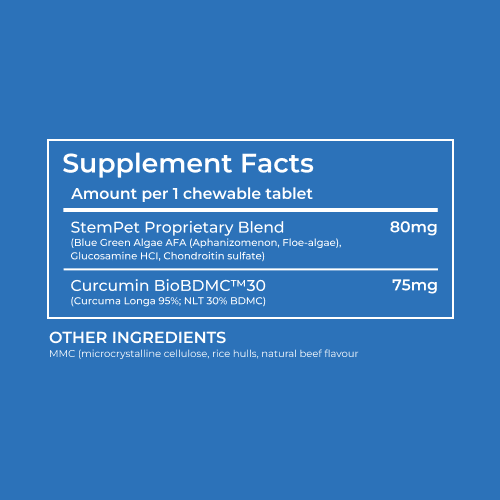 StemPet Proprietary Blend: A unique combination of Blue Green Algae, Glucosamine HCI, and Chondroitin Sulfate, this blend activates stem cells and promotes joint health, ensuring your pet stays agile and comfortable.